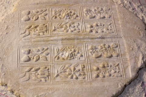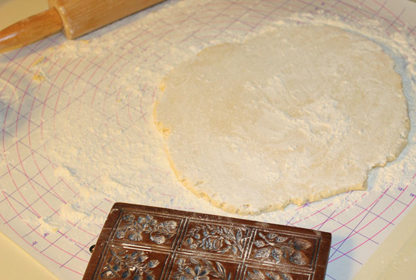 Dust the dough and the wooden mold with flour. Press the mold firmly into the dough and lift off carefully.