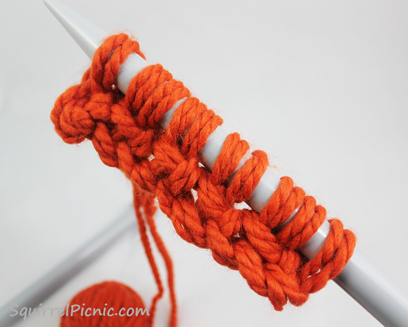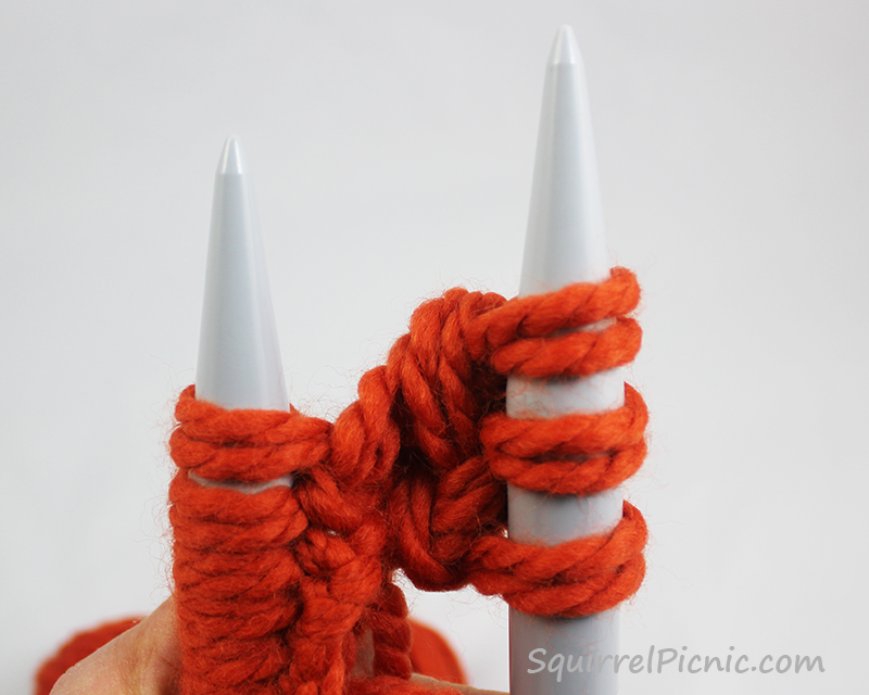 Knit the next stitch by inserting your needle as you normally would and wrap the working yarn around behind the right-hand needle, between the needles, and to the front.