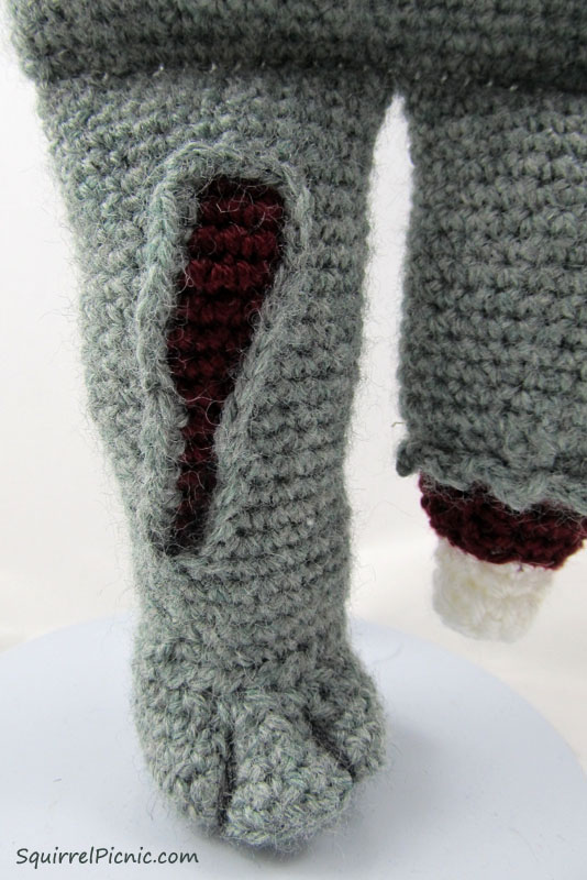 Stuff a leg and foot. Pin and sew together using tail from foot. Repeat with opposite leg.