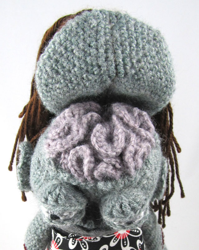 As you could probably already guess, for this challenge Shelby asked me to make him a zombie version of myself (a zombie self-portrait if you will). I set my heart on a few details from the start: an exposed brain with a flap of scalp, an eye that could pop out of the socket, and an arm that’s been cut off at the elbow. Of those three details, the eyes were the hardest, and I’m still not thrilled with how bug-eyed my zombie looks. So when I decided to make a zombie version of my husband to accompany the zombie version of me, I chose to simplify the construction of some of the details. Before I knew it, I had two very different patterns. The bodies and appendages are basically the same, but details like the eyes, brain opening, hair, and limbs are more complicated on the girl zombie. Have fun picking and choosing which details you like between the girl and boy zombies to make your zombie uniquely your own.