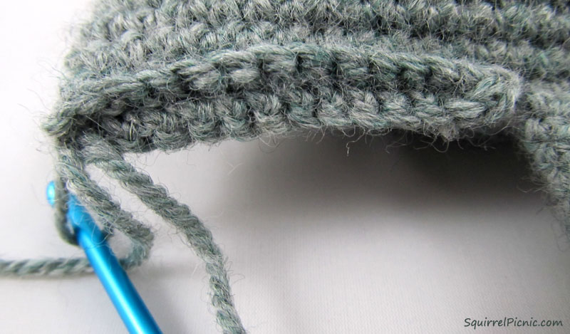 Flatten the last row at the bottom of the body and sc it closed with 28 scs. Ch 1 and turn. Do not FO. You will proceed to the first leg next.