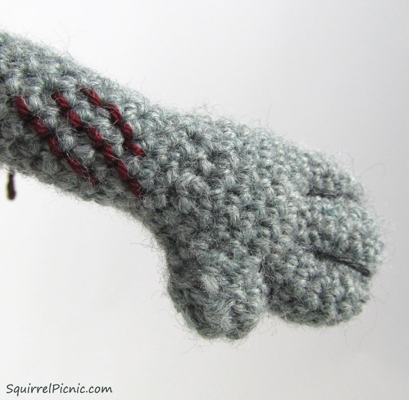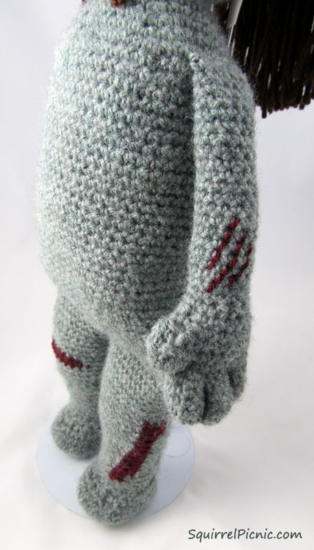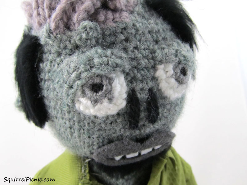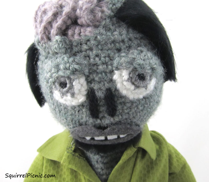 My husband is the best. Since the start of Squirrel Picnic, he’s had to put up with crochet squirrels coming on vacation with us, weekends sacrificed to endless crochet craziness, and a living room that is almost always covered in yarn. He’s also been my best adviser, weighing in on everything from yarn color to construction. He has a very good mechanical mind. For these and so many other reasons, I am very pleased to be able to dedicate Make It! Challenge #8 to him — it’s well deserved and long overdue. And, yes, he advised me on everything for this project, even coming with me to the yarn shop to pick out zombie colors.