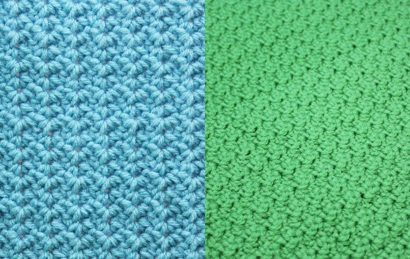 To add textural variety, I chose two different stitch patterns for the backgrounds. For the sky, I chose a simple Star Stitch pattern that would give a flat texture without creating distinct rows. For the grass, I chose another simple stitch pattern called the Cobble Stitch or Griddle Stitch, which alternates single crochet and double crochet stitches to create a bumpy texture, like clumps of grass.