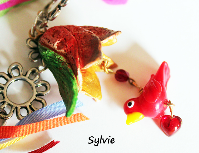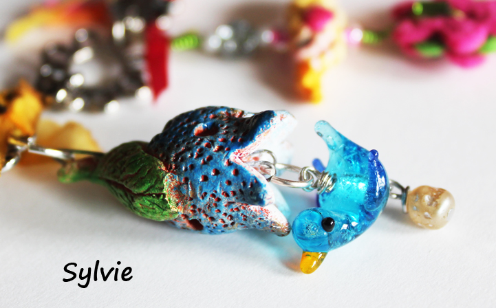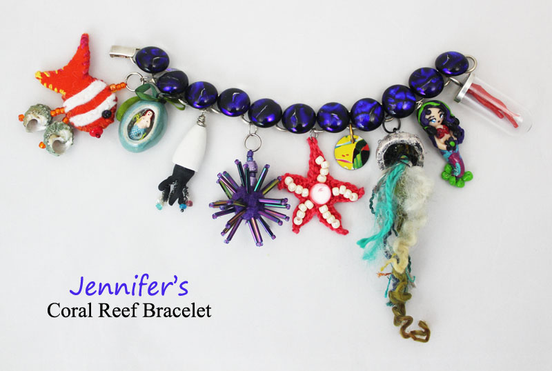 And so, back in June of 2014, six women met to begin a charm exchange adventure. There was Sylvie, an illustrator, graphic designer, and jewelry maker, who chose the theme āEye Adore Youā for her necklace with the intent of filling it with eyeballs and hearts. There was Annie, who creates three-dimensional sculptural works with handmade wool felt. She chose the theme āBirds and Flowersā for her colorful and vibrant necklace. Then there was Erikia, an LED-hula-hoop maker by day and tin-punch jewelry artist by night, who chose the theme āIn the Darkā for her necklace. We were also lucky to add a few long-distance charmies to the group: Rosalind, an artist in Canada, chose the theme āGarden of Earthly Delightsā for her Bosch-inspired necklace and Alexandra, a student,Ā chose kokeshi dolls as her theme. And finally that leaves me ā I chose coral reefs.