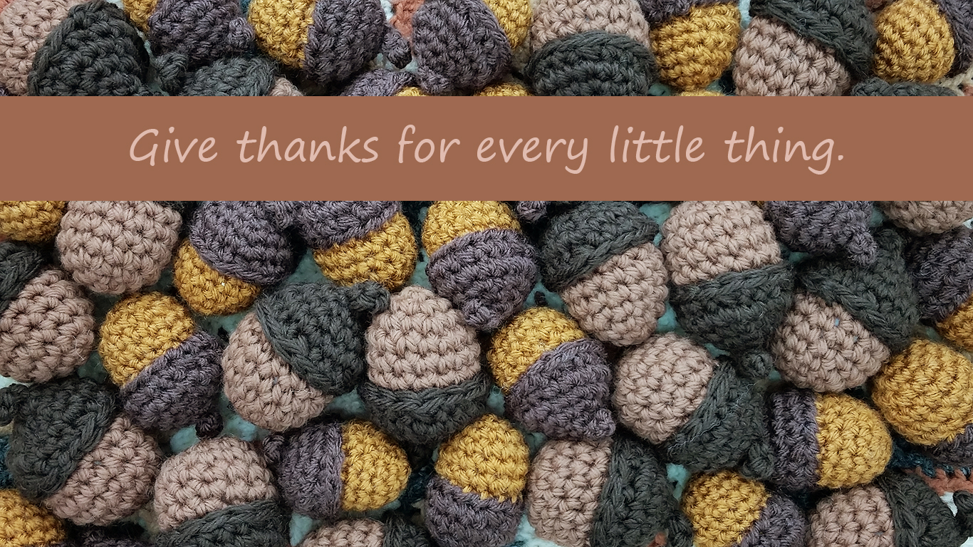 Speaking of designing fun things. I wanted to give you a present to help you celebrate Thanksgiving. Even if you are not in the U.S. you can use this as a reminder to be grateful for all the big and little blessings in your life. It’s an image of crocheted acorns that you can save as your wall paper on your desktop or mobile phone. I crocheted each of these acorns on my commute to and from work over the past few weeks. They are so fun and easy to make.