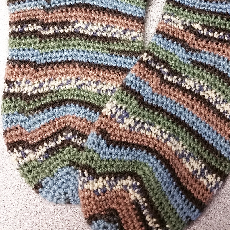 The fact that this pattern is worked almost entirely in single crochet is what gives me pause about giving it my 100% recommendation as a beginner pattern. Sure, most anyone who has some crochet experience will know how to make a single crochet stitch, but I suspect after a while it will become just as tedious a task for a beginner as it was for me! It takes a lot longer to single crochet a sock than most of the other stitches you could use. And using single crochet also creates a stiff fabric that lacks ease. Also this pattern is worked in joined rounds and the instructions explicitly say to place the slip-stitch joins on the underside of the foot. This means that the person wearing the sock will be walking on the joins, which I find uncomfortable. Despite my opinions, this is still a great pattern and one I will continue to recommend to beginners.