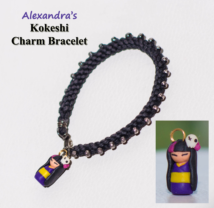 Rosalind and I weren’t alone in our struggle with scale. Annie agrees that making charms this tiny poses a challenge, but I think she succeeded handily with her felt and bead charms for Alexandra’s Kokeshi Doll bracelet. All of the stitching is painstakingly done by hand, and as always, Annie’s eye for color shines through.
