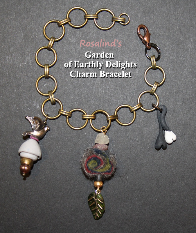 Rosalind used polymer clay to sculpt a mermaid charm and a squid charm for my Coral Reef bracelet. In the squid, she also added oxidized sterling silver chain and some gemstones. Even though she also found that working in this scale has its difficulties, I’m so impressed by all the detail she has managed to include in these charms. Keep in mind that they are under an inch long!
