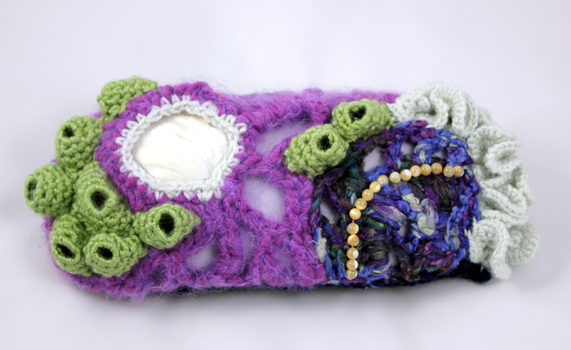 Sylvie and Annie made such nice boxes, I decided after the first meeting to try to make a box of my own. Inspired by the Smithsonian Crochet Coral Reef exhibit, I tried my hand at making a freeform crochet reef box. It was my first ever attempt at freeform crochet. You might guess, given my affinity for patterns, that this was a challenge for me, and it was at first. Eventually I was able to let loose and go wild. I’m not sure it’s a success, but it was sure fun to try.