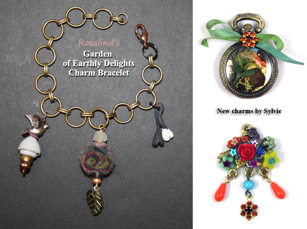 Sylvie created a tiny diorama inside a mini pocket watch for one of her charms for Rosalind’s Garden of Earthly Delights bracelet. It features a teeny baby with Monarch butterfly wings amid the moss of a forest floor. For her second charm, she brought new life to a piece of broken jewelry with the addition of colorful vintage floral beads.