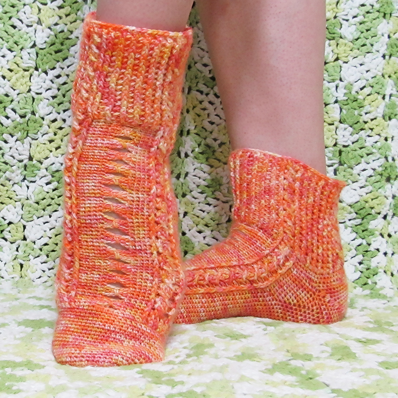 Once again, June’s sock pattern is “Ribbons & Bows” by Jerry Rigdon. It features a toe-up construction and afterthought heel. The bottom of the foot is done in single crochet stitches. The openwork center panel of stitches creates little bows up the top of the foot. Cables on either side of this look like jaunty ribbons. The combination makes for a fun sock project that is fast and easy to do.