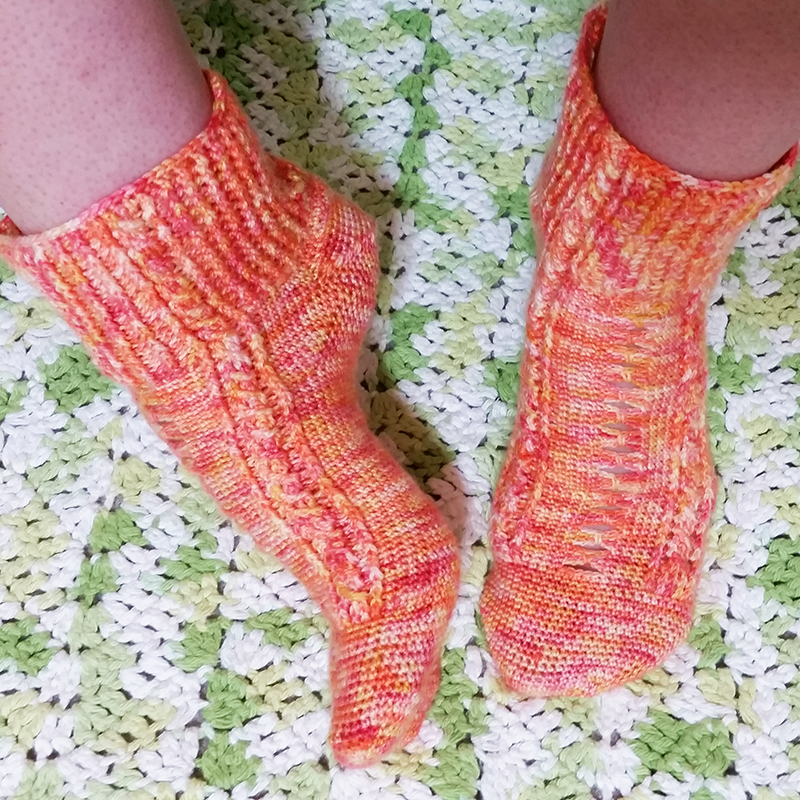 As you may recall, my May sock didn’t go as well as expected (due to a touch of user error… and general malaise), so I declared a do-over! I chose a fingering-weight merino from Cozy Rabbit Farm. I couldn’t tell you what this glorious colorway is (it’s not listed on their website and the belly tag doesn’t list it), so I think I’ll call it orange sherbet.
