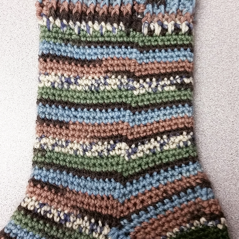 A word of caution, though: single crochet provides very little ease, so it is important to check your gauge before starting out and to try on the sock as you go. For this sock I ended up working the largest pattern size with a D-3 (3.25 mm) hook. This worked out fine, but I probably could’ve gone with a larger hook, knowing that my single-crochet stitches tend to be tighter.
