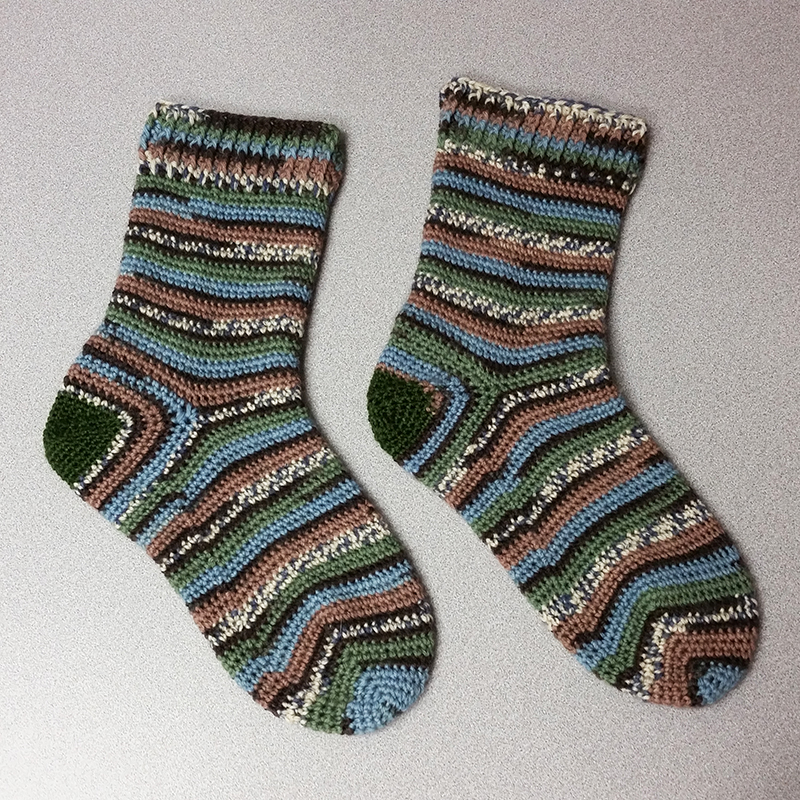 Another detail worth mentioning is the afterthought heel. Afterthought heels use an attached chain to create a hole where the heel will be stitched in later. After you’ve finished with the sock, you go back to this heel, pull up a loop with the RS facing, and place your stitches evenly around the hole. Then you continue crocheting in the round, while decreasing at the two corners until you have about 12-15 stitches. You FO and use the tail to sew the remaining stitches closed.