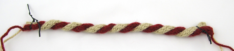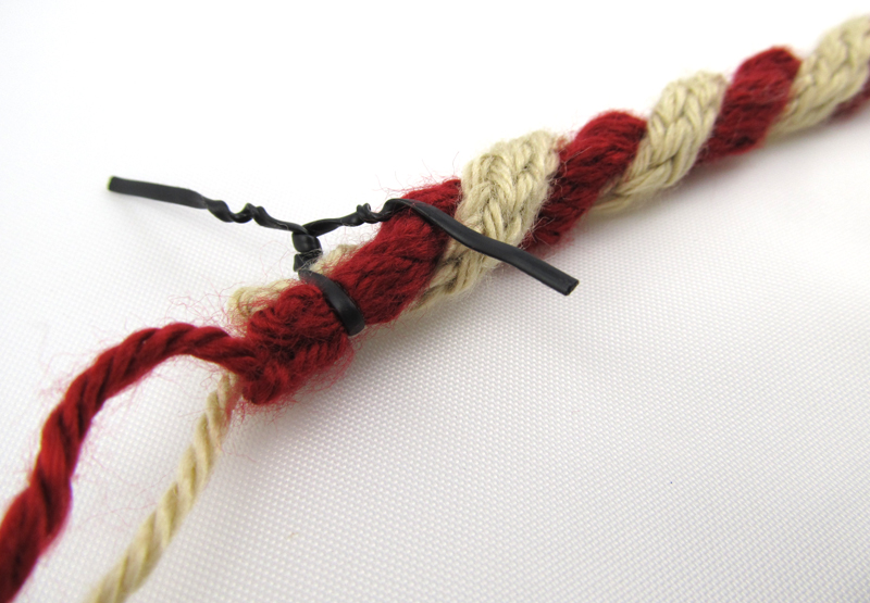 Twist the red cord 18-20 times. Align both cords and bind them together at each end with a twist tie, maintaining the twist in the red cord while doing so.