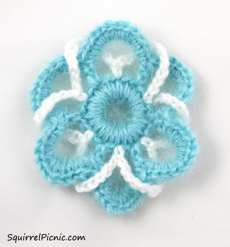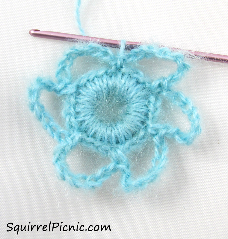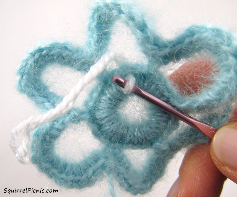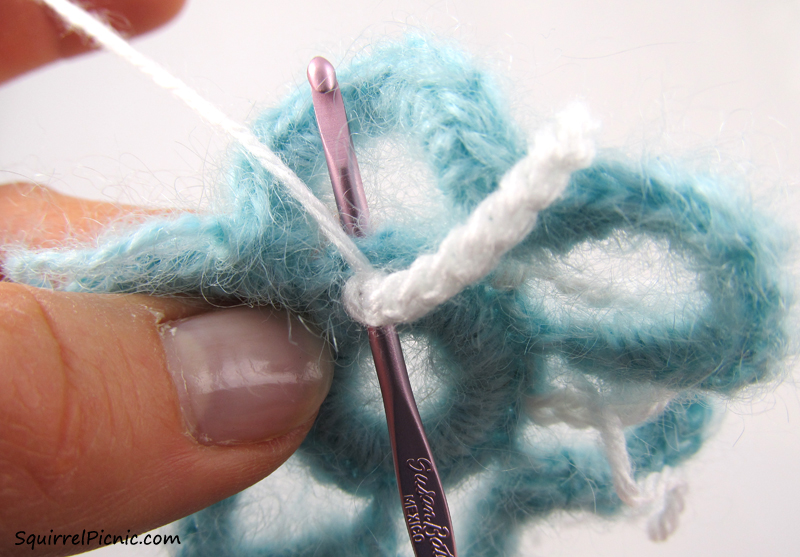 Ch 12. Hold the next aqua loop backward. Working in front of the loop this time, sc in the next center st.