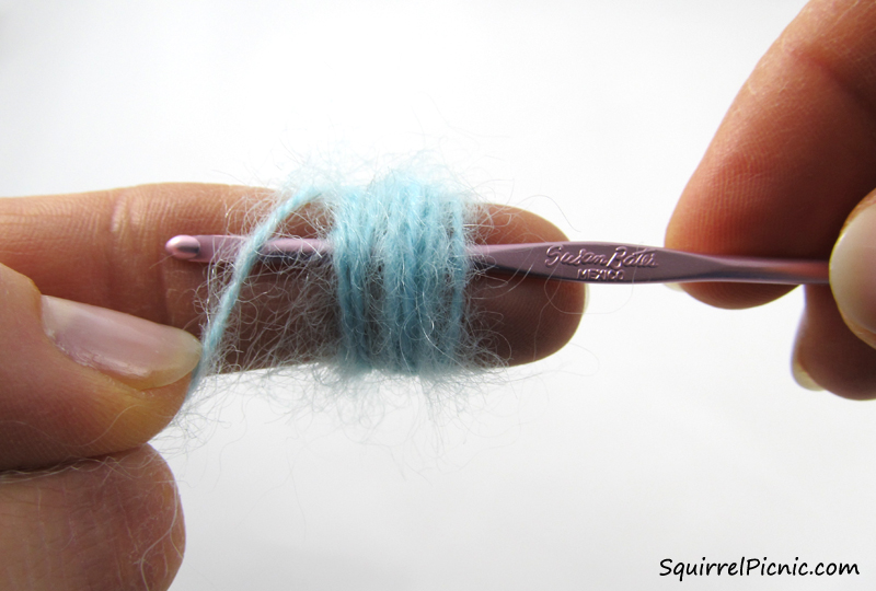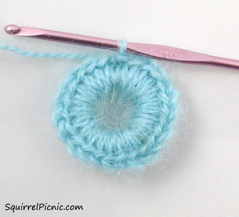 Wrap aqua yarn around index finger 10 times to form a ring. Insert crochet hook, yo, and pull through all the loops. Slst to secure.