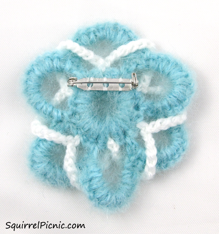 Rnd 4: Hold the brooch with RS facing. Ensuring that your yarn is in front of the brooch, attach white yarn in any center sc of the 3 skipped in Rnd 2.